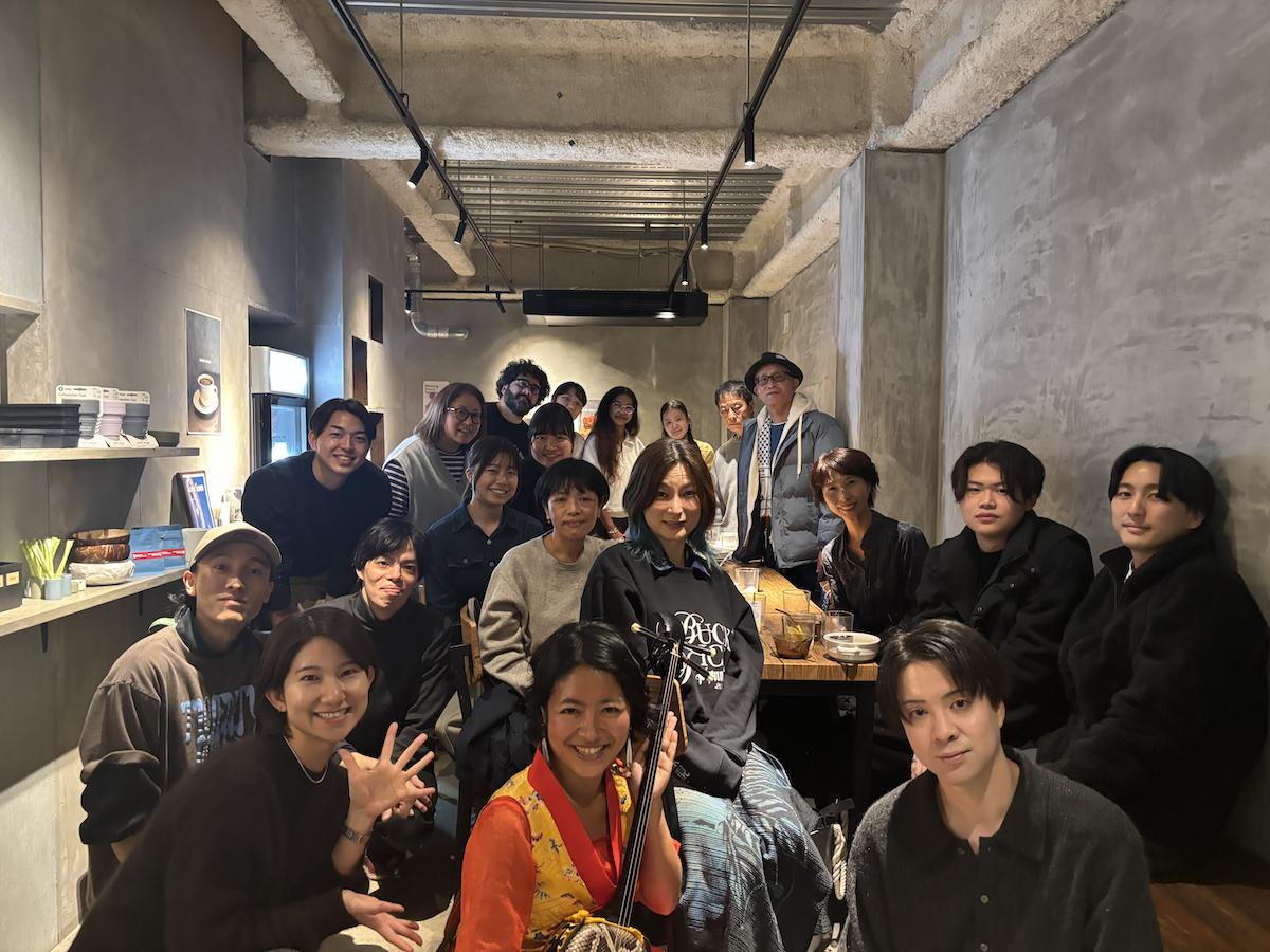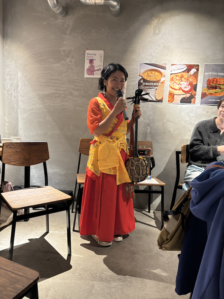 OMFからは佐々木彩乃、umbresからは花井美仁さんが登場し、さらに三線(さんしん)奏者・アクティビストの桑江優稀乃さんを登壇者に迎えた。桑江さんによる華やかな三線と歌の披露に始まり、終始和やかな雰囲気に包まれた会であった。