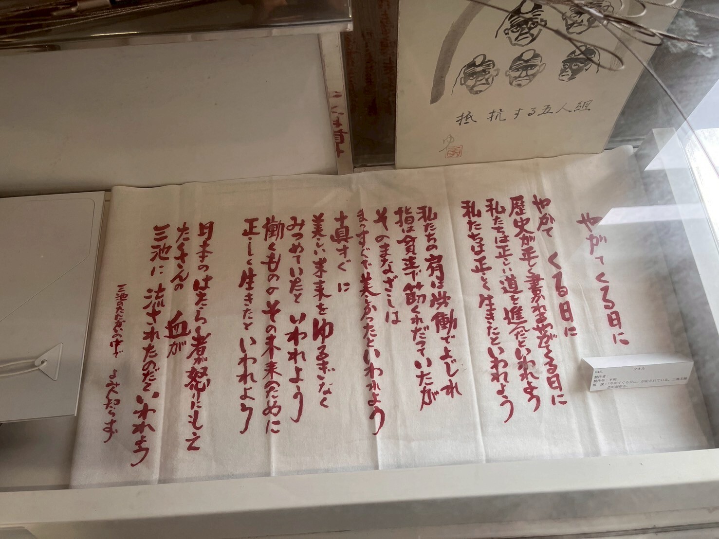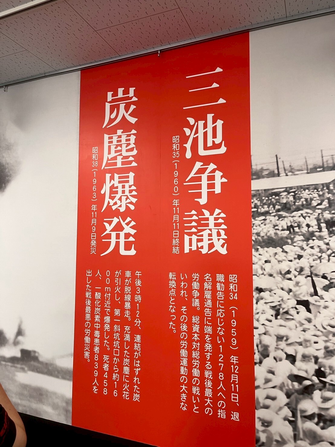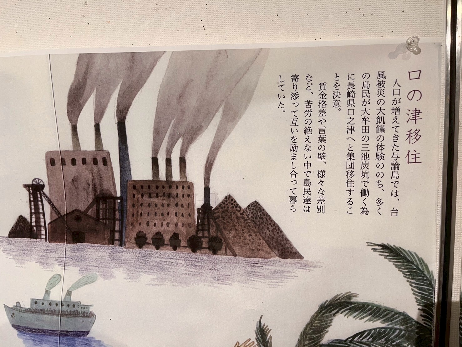 しかし、フィールドワーク当日に感じたことはそれだけではありませんでした。「総資本対総労働の戦い」とも表現される「三池争議」は「闘争」「争議」どちらの言葉で表現するかでスタンスに違いがあったたことや、ボランティアの方に教育現場での様子を伺い、「三池争議」は労働条件の交渉等の具体的な問題以上のイデオロギーの対立と、それに翻弄される人々の様子を知る機会だったと思います。また、もう一つ印象に残ったのは、当日開催されていた企画展「与論島から三池へ その歩みと今をたどる」の展示です。1898年に与論島を襲った台風をきっかけに、三池の石炭を大型船に積み込む長崎県・口之津や大牟田への移住が始まった経緯や、移住後の過酷な労働、賃金格差、言葉の壁などの差別の歴史が紹介されていました。炭鉱という国家が力を注いだ事業の現場で、不当な扱いを受ける人々、そして移住者という脆弱な立場にある人々への差別によって問題の認識と解決が遠のくという構造が、経済成長という国家の一大目標の中で苦しむ水俣の人々、そして脆弱な立場にあった漁師から被害が広がるという、水俣で見てきた構造と似通うものがあると感じました。同時に、不当な扱いを受けていた与論島からの移住者を想い、その歴史を伝えようとする企画展のおかげで、石炭産業という大きな歴史の流れの裏で記憶からこぼれ落ちそうになっていた人々の物語を知り、その記憶を流れ去らせない一端を担えるようで、この企画展と巡りあえて嬉しかったです。
