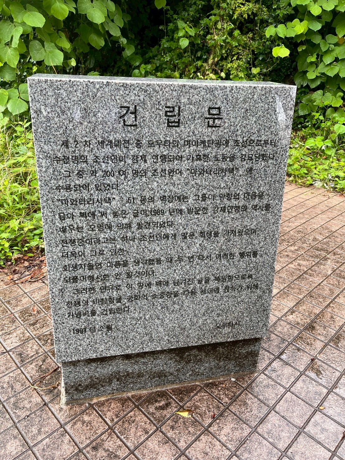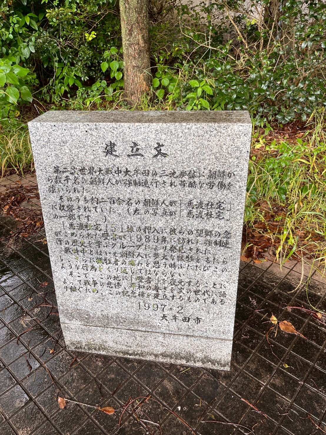 馬渡第一公園内にある、馬渡社宅跡記念碑には、当時の社宅の写真や日本語と韓国語の建立文がありました。日本語の碑文は1997年にできたもので、韓国語の碑文は2022年3月と比較的最近追加されました。この地域の方々は、和解に重点を置く活動をされていたということです。また、工場は臨海部に乱立する場合が多いですが、ここ、三池炭鉱の場合は石炭が取れたところに工場を立地させたので内陸部に工場が集まる、という特徴も説明していただきました。