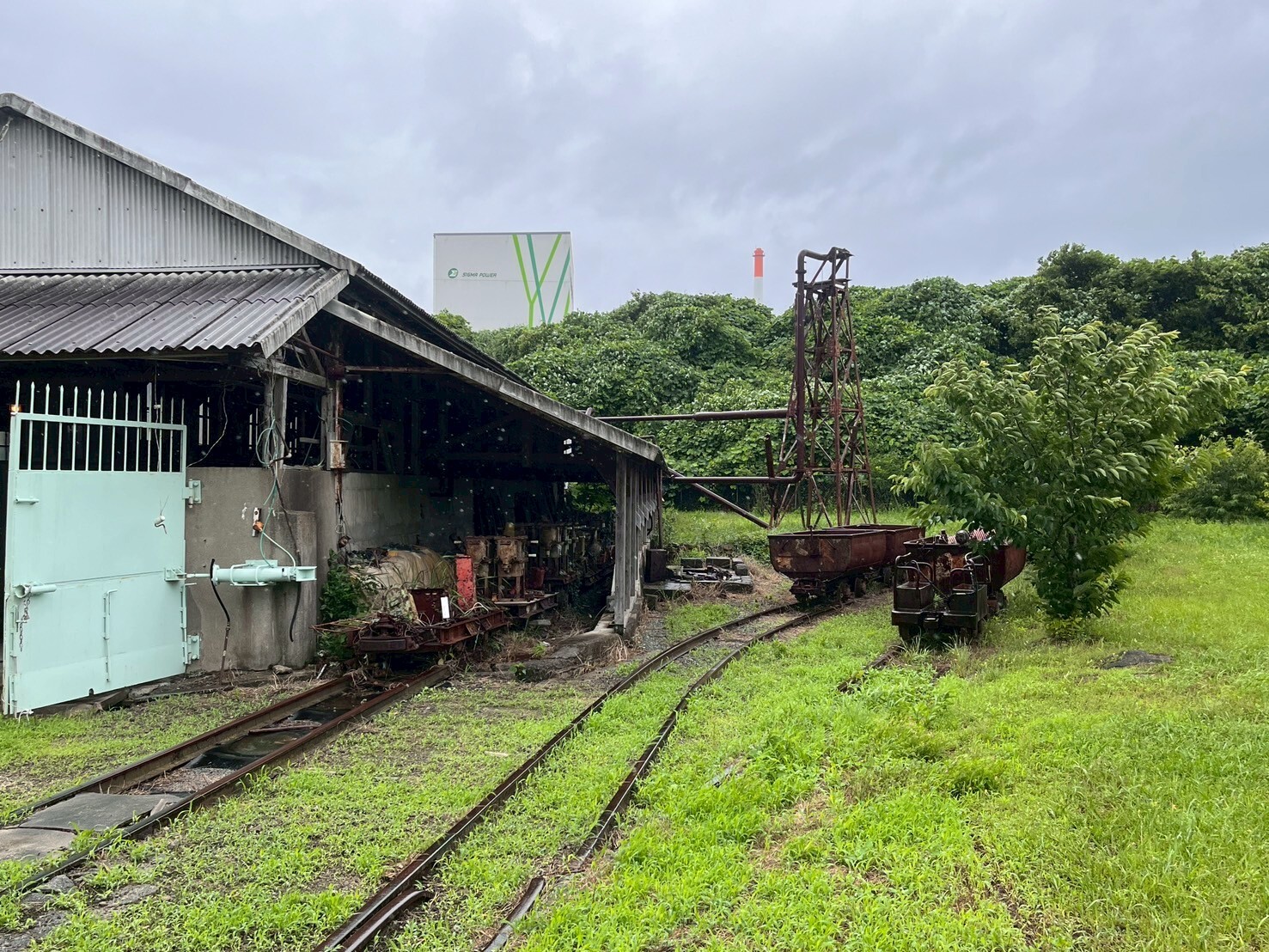 当日は、土砂災害や河川の氾濫を警戒するほどの大雨の予測でしたが、幸いにも曇りや小雨程度で、予定通りに実施することができました。午前9時40分に西鉄大牟田駅に着いてから、世界文化遺産にも登録されている、三池炭鉱専用鉄道で記念写真を撮影しました。三池鉄道は10km以上続き、10個以上あった坑口を繋いでいたそうです。