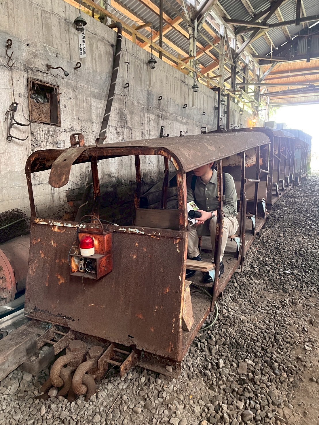 三川坑では、三池炭鉱の歴史を展示するパネルや、当時の労働者や労働組合が使っていた道具が展示されていました。当時使われていた鉄道の車体を見学し、坑内への入り口に入ることができました。注意事項の看板なども残っており、炭鉱労働の現場を感じられました。当時使われていた機械が残された部屋に入ると、例え現在は使われていなくても、機械が現役の時の熱気を感じられるような迫力がありました。